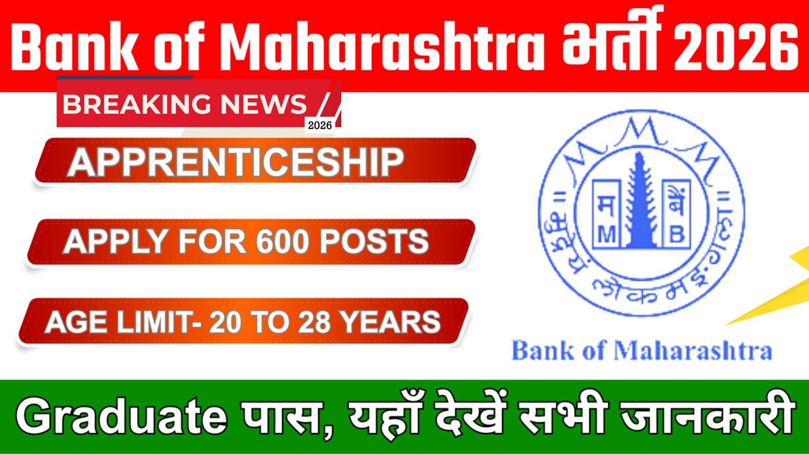 Bank of Maharashtra Apprentice Recruitment 2026: 600 पदों पर भर्ती, जानें पूरी जानकारी