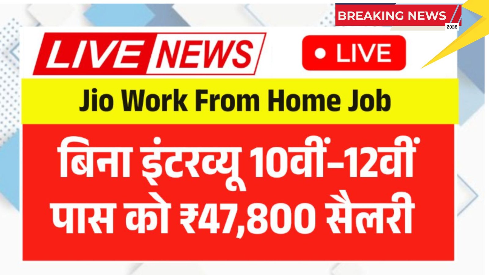 Jio Work From Home Job और Jio Work From Home Yojana 2026 10वीं–12वीं पास युवाओं, छात्रों और महिलाओं के लिए रोजगार का एक संभावित अवसर बनकर सामने आ रही है। बिना इंटरव्यू, घर बैठे काम और ₹47,800 तक की संभावित सैलरी की वजह से यह योजना काफी चर्चा में है। हालांकि अभी तक किसी भी तरह की अंतिम और आधिकारिक घोषणा का इंतजार है। उम्मीदवारों के लिए जरूरी है कि वे केवल आधिकारिक जानकारी पर भरोसा करें और सही सूचना मिलने के बाद ही आवेदन करें। सतर्कता और सही जानकारी के साथ यह अवसर कई लोगों के लिए फायदेमंद साबित हो सकता है।