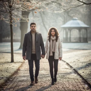 Winter visuals naturally support romance. Cozy clothing, soft light, and misty surroundings create depth and intimacy in images. For couples, winter outfits like coats, scarves, mufflers, and sweaters add texture and style while allowing natural closeness.