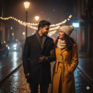 “Generate a 4K HD romantic winter night portrait of an Indian couple walking under street lights. Both wear stylish winter outfits with coats and scarves. They are standing close, smiling softly. Use warm street light glow, bokeh effects, DSLR low-light clarity, and realistic skin tones for a cozy winter night romance vibe.”