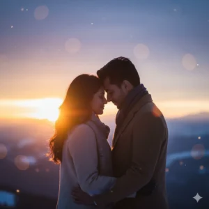 “Create a cinematic 4K HD winter sunset portrait of a stylish Indian couple standing close, slightly touching foreheads. Both wear winter coats, backlit by soft orange sunset light. Use DSLR depth of field, realistic silhouettes, gentle lens flare, and cool winter tones for a poetic, emotional romantic scene.”